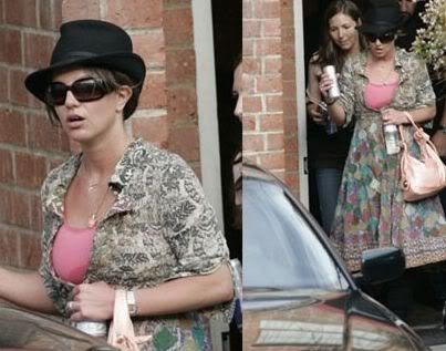 Britney Spears leaving her dance studio. Seriously, wtf do you call this conglomeration of Salvation Army rejects she's wearing? I'm stumped. I do like the hat, but, I think she borrowed it from Pete Doherty. Poontang was probably hoping he forgot some stash in it.
